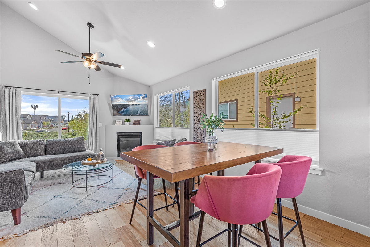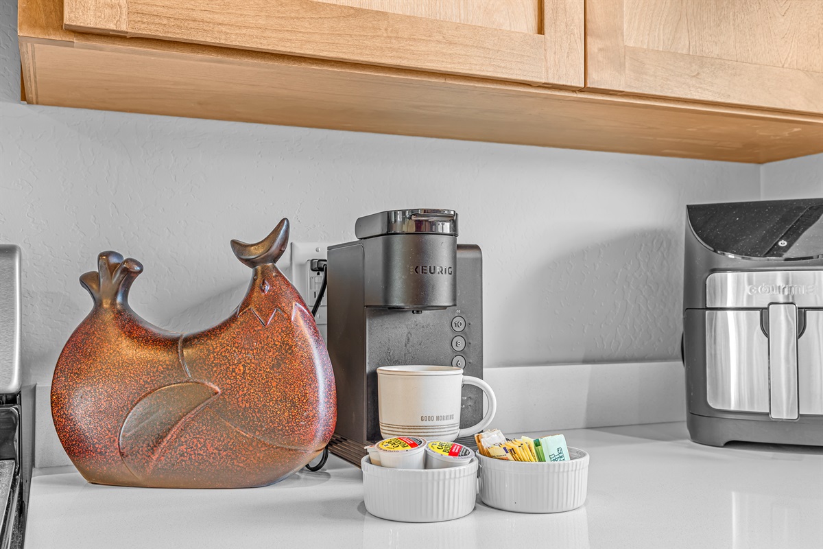 Inside, you’ll find vaulted ceilings, natural light throughout, and an open-concept living space designed for gathering and relaxing. Enjoy cozy evenings by the fireplace, stream your favorite shows on the Smart TV with Roku, or prepare a meal in the fully equipped kitchen featuring both Keurig and drip coffee options.